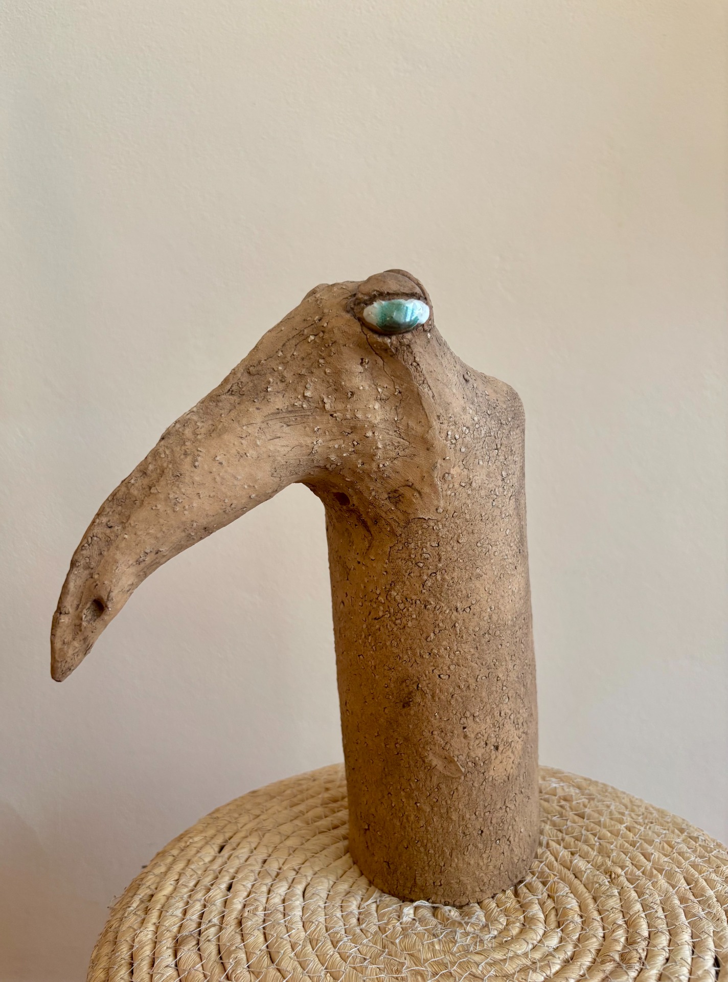 Tato originální keramická plastika zaujme svým jedinečným tvarem a výrazným charakterem. Stylizovaná ptačí hlava s dlouhým zobákem působí jako malý umělecký objekt, který přitáhne pozornost v každém interiéru. Díky ručnímu zpracování má každý kus svou vlastní strukturu, drobné nepravidelnosti a autentický vzhled.